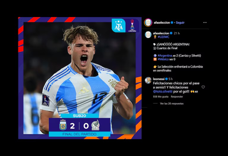 Mateo Silvetti fue el responsable de destrabar el partido que Argentina le ganó 1-0 a Colombia y que valió el pase a la final del Mundial Sub 20 de Chile. El compañero de Lionel Messi en el Inter Miami abrió el marcador en el segundo tiempo del duelo en el Estadio Nacional Julio Martínez Pradanos de Santiago.