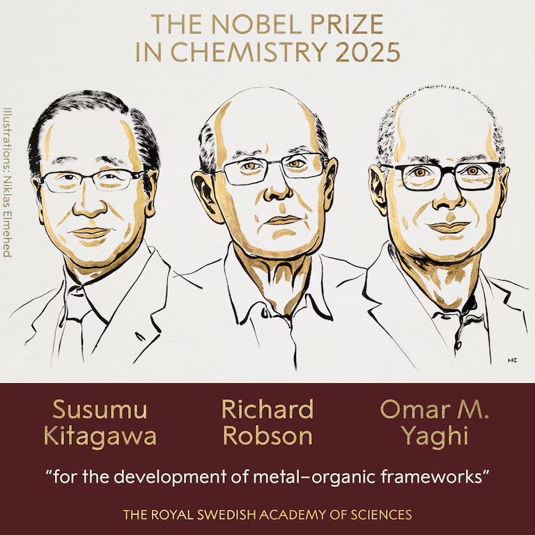 La Real Academia de Ciencias de Suecia ha decidido otorgar el Premio Nobel de Química 2025 a Susumu Kitagawa de la Universidad de Kyoto, Richard Robson de la Universidad de Melbourne y Omar M. Yaghi de la Universidad de California en Berkeley por el desarrollo de los marcos metal-orgánicos (MOF), una nueva arquitectura molecular con amplias aplicaciones en la ciencia y la industria.