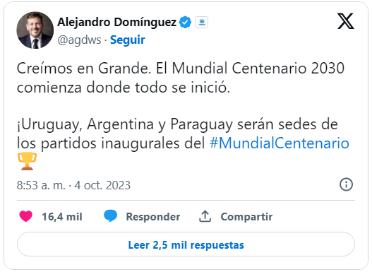 “¡Qué gran mensaje de paz, tolerancia e inclusión!. En 2030, tendremos una huella global única, tres continentes —África, Europa y América del Sur— seis países —Argentina, Marruecos, Paraguay, Portugal, España y Uruguay— dando la bienvenida y uniendo al mundo mientras celebramos juntos el hermoso juego, el centenario y la Copa Mundial de la Fifa”, agregó.